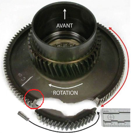 L'examen du boîtier d'engrenages a révélé qu'une partie de l'arbre porte-pignon hélicoïdal du couplemètre (appelée ici roue dentée du couplemètre), référence 6893673-W, numéro de série NN144767, s'était séparée et a été retrouvée détachée à l'intérieur du boîtier d'engrenages.