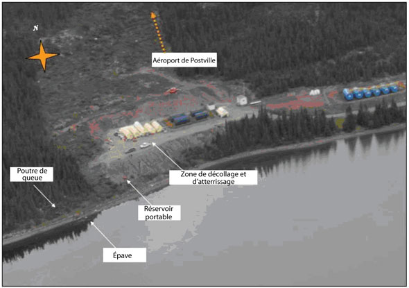 La zone de ravitaillement est une aire plate et recouverte de gravier, qui est bordée à l'ouest par des arbres, à l'est par les réservoirs de carburant diesel de la ville et par une voie de passage, au nord par des broussailles et au sud par le plan d'eau de la baie de Kaipokok (voir l'Annexe A – Photo du lieu de l'accident). L'aire d'atterrissage des hélicoptères mesure environ 100 pieds sur 55 pieds, et elle se trouve à environ 40 pieds au-dessus de la rive. Les hélicoptères utilisant la zone de ravitaillement se posent du côté sud des réservoirs de carburant, face au nord, et leur poutre de queue surplombe le remblai qui se trouve entre l'aire d'atterrissage et la rive. Il y a suffisamment d'espace pour que trois ou quatre hélicoptères puissent s'y poser à la fois et exécuter des manœuvres. Tous les réservoirs se trouvent du côté nord de la zone de ravitaillement. Normalement, les hélicoptères arrivent et partent face au vent. Le vent souffle habituellement de l'ouest, et la plupart des départs de la zone de ravitaillement se font en direction ouest.
