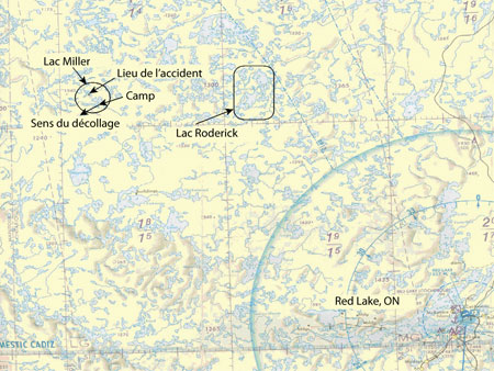 Les enquêteurs n'ont pas pu déterminer précisément quel secteur du lac avait été utilisé pour le décollage. Toutefois, une aire de décollage d'une longueur suffisante pour un départ vers le sud-ouest, dans le vent au moment de l'accident, s'étend du camp de l'exploitant vers le sud-ouest. Le lieu de l'accident se trouve à environ deux milles marins au nord-ouest du camp du lac Miller. Au moment de l'impact, l'hydravion se dirigeait vers le sud-ouest. La raison pour laquelle le pilote a changé de direction à ce moment-là du vol n'a pas été déterminée, mais l'exploitant avait des bateaux à un portage situé près du lieu de l'accident.