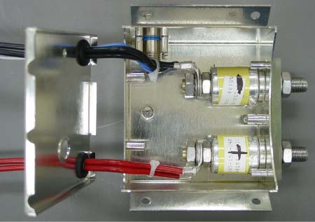 Un filtre antibrouillage électromagnétique est monté sur le dessus de chaque motopompe à courant continu. Ce filtre est constitué d'un boîtier en acier inoxydable à l'intérieur duquel se trouvent deux condensateurs enroulés. Une extrémité de chacun des condensateurs est soudée au boîtier du filtre près des bornes, et l'autre extrémité est connectée à la borne. Les bornes sont des boulons qui passent au centre des condensateurs et des écrous qui se trouvent à l'extrémité intérieure du condensateur. Une extrémité des bornes offre un point de connexion au courant positif ou négatif de la motopompe. L'autre extrémité permet de connecter les fils électriques qui sortent du boîtier et qui assurent la connexion électrique avec la motopompe (voir la Photo 1). L'intérieur du filtre est rempli d'un enrobage d'un poids exact, qui sert à dissiper la chaleur et à atténuer la vibration des condensateurs. L'enrobage couvre presque complètement les condensateurs. Une plaque en acier inoxydable est soudée à la partie inférieure du boîtier afin de sceller complètement le filtre. Ce dernier est fixé à la motopompe à courant continu au moyen de quatre vis à métaux. Les fils d'alimentation électrique de l'avion sont connectés au goujon en laiton du condensateur au moyen d'un écrou et d'une rondelle. Il est essentiel de serrer au couple prescrit les écrous de fixation pour assurer une bonne conductivité électrique.
