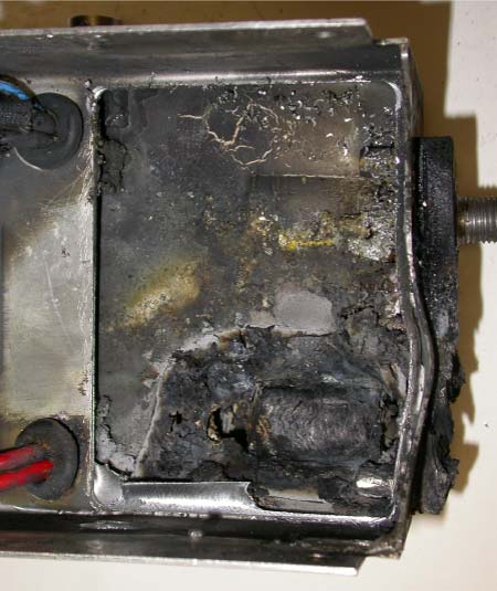 Les parties supérieure et inférieure du filtre ont été défaites, et l'intérieur du filtre a été examiné (voir la Photo 2). Une partie de la borne négative du condensateur n'était pas couverte par l'enrobage. La borne positive du condensateur était presque entièrement détruite. Les dommages correspondaient à ceux causés par un court-circuit dans le condensateur.