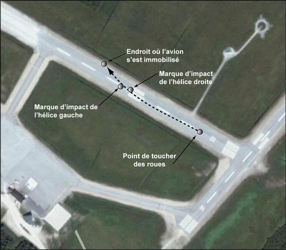 À l'arrivée des enquêteurs, l'avion avait déjà été traîné hors de la piste vers l'aire de trafic où on l'avait immobilisé en prévision de l'examen. Pendant l'examen de la piste, on a découvert des marques d'impact des deux hélices (voir l'Annexe A). Les marques confirment que le train principal droit s'est affaissé en premier, suivi du reste du train. Les volets et le train d'atterrissage étaient en position rentrée. On a constaté que le dessous de l'extrémité de l'aile droite, le dessous du fuselage et les trappes du train avant étaient endommagés. Les pales de l'hélice du moteur droit étaient repliées sur le fuseau-moteur mais n'étaient pas en drapeau. Les pales de l'hélice du moteur gauche étaient repliées sur le fuseau-moteur et étaient en drapeau.