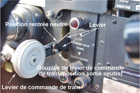 Le levier de commande de train est doté d'un ressort qui le garde en position avant (vers la console). Une goupille sur l'intérieur du levier s'appuie contre un levier qui sert de butée de position neutre (voir la Photo 1). Un ressort fait en sorte que le levier de commande de train soit maintenu fermement en position avant et qu'il ne puisse pas être déplacé par inadvertance au-delà de la butée de position neutre. On a découvert qu'une extrémité du ressort était brisée et que le ressort semblait faible. En raison de cette anomalie, le levier de commande était lâche et n'était pas maintenu fermement en position avant. Pendant les essais, on a constaté qu'il était facile de pousser le levier de commande de train au-delà de la position sortie neutre lorsqu'il n'y avait aucun poids sur les roues et que l'interrupteur général était sur « ON ». Lorsqu'il y avait du poids sur les roues et que l'interrupteur général était sur « ON », l'interrupteur d'interdiction de rentrée du train empêchait tout déplacement du levier de commande de train au-delà de la butée de position neutre. Par contre, lorsqu'il n'y avait aucun poids sur les roues, il était facile de placer le levier du train d'atterrissage légèrement au-dessus de l'axe longitudinal de la butée de position neutre à un endroit où le verrou à solénoïde ne s'enclenchait pas et où les klaxons n'étaient pas actionnés. En mettant du poids sur les roues, il était possible de placer le levier de commande de train en position rentrée. De plus, en déplaçant le levier de commande de train à une position située à environ 0,375 po au-dessus de la position rentrée neutre, on a réussi à déclencher la séquence de rentrée du train et le train est rentré.