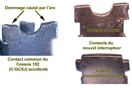 Les composants en plastique du disjoncteur ont été peu endommagés par la chaleur. Le bilame a donc fondu à cause de la chaleur générée à l'intérieur de celui-ci, et non à l'extérieur. Une analyse des charges produites par la batterie a révélé que les batteries d'aéronef peuvent produire une intensité de court-circuit de plus de 1800 ampères. Pendant l'essai, le fait de relier directement le disjoncteur à la batterie peut avoir imposé une intensité élevée sur celui-ci, ce qui a produit une chaleur élevée dépassant les limites du bilame du disjoncteur.
