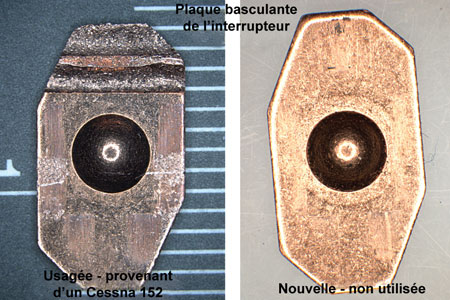 Un interrupteur de phare d'atterrissage usagé provenant d'un autre avion a été envoyé au Laboratoire technique du BST aux fins d'examen. Il avait été déposé lorsqu'on l'avait jugé défectueux, car la touche basculait difficilement. Il était identique à l'interrupteur de l'avion accidenté sur le plan de sa composition comme de sa structure. Même s'il fallait pousser la touche avec un peu plus de force pour la faire basculer, l'interrupteur était fonctionnel. Ultérieurement, un examen interne a permis de constater que l'interrupteur manquait de lubrifiant, ce qui pouvait expliquer le fait qu'il était difficile de le faire fonctionner. La plaque à bascule en cuivre portait des traces d'usure causées par l'arc et le frottement (voir la photo 4). On constatait aussi les traces d'une forte oxydation autour des parties évidemment endommagées par l'arc. L'interrupteur usagé avait été fourni pour permettre de déterminer la température des contacts à découvert de l'interrupteur lorsqu'un courant électrique continu était appliqué pendant un certain temps. Pour ce faire, on a utilisé une charge électrique semblable à celle imposée par une lampe de 250 W raccordée à une source d'alimentation de 28 V c.c. Après une période de trois heures, la température des contacts était de 53,5 °C, ce qui est acceptable.