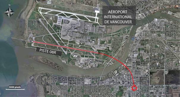 L'aéroport régional de Pitt Meadows se trouve à quelque 19 milles marins (nm) à l'est nord est de l'aéroport international de Vancouver, mais le pilote avait demandé à décoller en direction sud afin de vérifier certains travaux de maintenance qui avaient récemment été effectués sur l'avion. Le pilote avait reçu l'autorisation de suivre la procédure publiée de décollage VOR Footnote 1 de la piste 08 droite (08R) de Vancouver, laquelle exige que le pilote vire à droite, à sa discrétion, au cap de 160° magnétiques vers le VOR de Vancouver (à 7 nm au sud), et qu'il monte jusqu'à 2000 pieds au dessus du niveau de la mer (asl). En franchissant 1000 pieds asl en montée, le pilote doit passer de la fréquence tour intérieure sud à la fréquence tour extérieure sud.