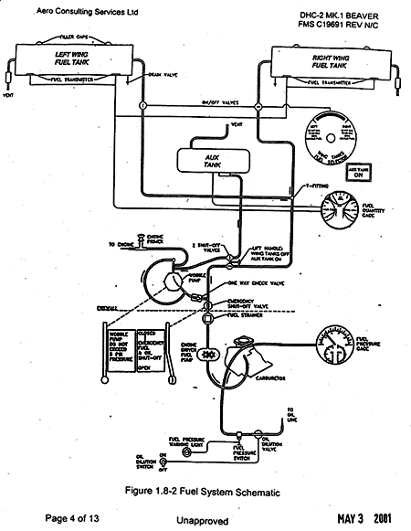 Le système d'alimentation en carburant d'origine du Beaver comprenait trois réservoirs indépendants situés sous le plancher de la cabine. Une pompe entraînée par le moteur aspire l'essence et un sélecteur permet de choisir le réservoir. Une pompe manuelle dont le levier est situé sur la console centrale assure l'alimentation en carburant en cas de bris de la pompe moteur. Le nouveau système ne conserve que le réservoir ventral avant d'une capacité de 29 gallons et qui est devenu un réservoir auxiliaire. Le système comprend deux sélecteurs de réservoir. Le sélecteur original situé à gauche du tableau de bord est réaffecté à l'opération de valves situées à l'emplanture de chaque aile. Un premier câble flexible transmet la commande du sélecteur à la valve de gauche. De celle-ci, le mouvement est transmis à la valve de droite par un câble secondaire qui est de moindre calibre. Ce dernier passe entre le toit de la cabine centrale et la finition intérieure. La rotation du sélecteur ouvre une des valves et ferme l'autre. Une plage rouge sur l'affichette du sélecteur des réservoirs d'aile entre la position gauche et la position droite interdit de placer le sélecteur sur cette position médiane. La photo 2 montre la position du sélecteur et l'affichette tels que trouvés dans l'avion. L'emplacement et l'apparence de l'affichette ne sont pas conformes au dessin MF001-003, et l'affichette indique à tort que le réservoir contient 79 gallons américains de carburant utilisable alors qu'elle devrait indiquer 76 gallons américains (voir l'annexe B). Le deuxième sélecteur, appelé AUXILIARY FUEL CONTROL, est situé sur le plancher, à l'avant gauche du siège du pilote. Il permet de sélectionner soit les réservoirs d'aile, soit le réservoir ventral (auxiliaire). Un témoin lumineux AUX TANK ON confirme cette sélection. Le supplément au manuel de vol pour la modification AWT stipule qu'un seul des trois réservoirs peut être sélectionné à la fois.