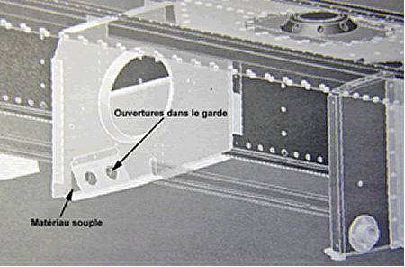 Le passage de l'essence d'une aile à l'autre devrait être arrêté au premier compartiment de chaque réservoir où est située la prise d'alimentation (voir l'annexe A). Ces compartiments sont munis d'un clapet de non-retour restreignant le retour de l'essence dans les compartiments extérieurs. Le clapet est constitué d'un matériau souple similaire au néoprène. Il est riveté sur la cloison extérieure, derrière un garde (référence MW14-99) qui en restreint le mouvement et en assure le bon positionnement. L'enquête révèle que la fabrication des gardes n'est pas conforme aux dessins (figure 1); en effet, deux ouvertures circulaires d'environ un pouce de diamètre n'ont pas été percées (photo 3). Normalement, les ouvertures permettent à l'essence d'exercer une pression sur le clapet pour favoriser la fermeture du clapet. Sans les ouvertures, le flux d'essence contourne le garde et peut soulever le côté du clapet. De plus, la cloison est montée à angle droit avec l'aile. Comme l'angle de dièdre est de 2° et que le seul facteur retenant le clapet contre la cloison est la gravité, le maintien du clapet contre la cloison n'est pas assuré. En conséquence, l'essence peut retourner vers les compartiments extérieurs.