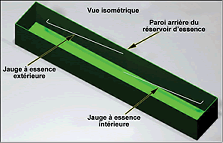 La modification du système d'alimentation en carburant incluait le remplacement de l'indicateur de niveau carburant d'origine par un triple indicateur de niveau carburant fabriqué par Westach. Les indicateurs de niveau sont identifiés FUEL LEFT, AUX FUEL et FUEL RIGHT. Les trois réservoirs étaient munis de jauges de type transducteur (modèle 395-5S-1B-5-24) également fabriquées par Westach. Deux jauges sont installées à mi-hauteur de la paroi arrière de chaque réservoir d'aile (figure 2). La jauge extérieure transmet le niveau d'essence pour la moitié supérieure du réservoir, et la jauge intérieure, pour la moitié inférieure. Le dessin d'AWT, MF001-005 rev IR, spécifiait que les jauges devaient être pliées en forme de U inversé. Toutefois, selon Westach, le modèle de jauge spécifié au dessin ne peut pas être plié en forme de U inversé; il peut seulement être plié près de son ancrage à un angle allant jusqu'à 90°. En conséquence, la forme des jauges était confome aux instructions de Westach, mais le dessin d'AWT ne l'était pas. Le numéro de pièce WS34T13 spécifié sur le dessin pour le triple indicateur de niveau carburant est incorrect. Ce numéro de pièce n'est pas connu de Westach. Seul l'índicateur portant le numéro de pièce A3T13-IV est recommandé pour utilisation avec les jauges de Westach. L'indicateur installé dans l'aéronef portait ce numéro.