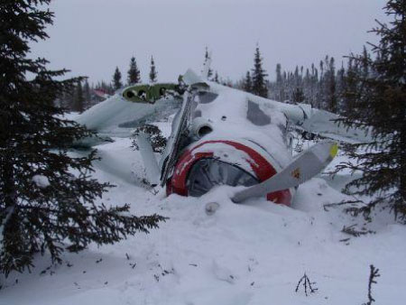 Il a sélectionné le réservoir ventral (réservoir auxiliaire), ramené la manette des gaz vers le tiers et actionné la pompe manuelle. Le moteur, qui continuait à être entraîné par l'hélice, a toussé à quelques reprises, mais la puissance n'a pu être rétablie. Le pilote a tenté sans succès d'atteindre un lac en vol plané. Il n'a pas eu le temps de sortir les volets à fond et ils sont restés sortis à 10 degrés. L'appareil a atterri sur un terrain peu boisé mais accidenté. Au premier contact, les skis et le train d'atterrissage principal ont été arrachés. L'appareil a glissé sur le ventre sur environ 100 pieds avant de s'immobiliser. L'aile droite s'est rompue et l'appareil s'est incliné à gauche. La cabine n'a pas subi de déformation importante mais les ancrages de deux sièges de la deuxième rangée ont été arrachés ainsi que la fixation de la ceinture de sécurité d'un troisième siège. Le passager assis derrière le pilote a subi de graves blessures au dos; le passager du siège avant a subi des blessures à la tête entraînant la perte d'un oeil.
