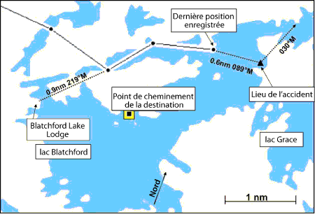 Alors qu'il était en route vers son point de destination, l'avion a légèrement dévié vers la gauche et vers la droite par rapport à sa trajectoire directe, et il a atteint la rive nord du lac Blatchford à environ 0,9 nm à l'est du pavillon. L'avion a alors pris un cap nord-est (s'éloignant du pavillon), et il a ralenti à 78 nœuds. Le récepteur a de nouveau enregistré des données à 0,6 nm à l'ouest du lieu de l'accident, alors que l'avion suivait un cap magnétique de 071 degrés à une vitesse-sol de 90 nœuds, avant de cesser d'enregistrer des données (voir la Figure 1). L'avion effectuait un virage vers la gauche quand il s'est mis à vibrer, tout juste avant de descendre brusquement et de s'écraser.