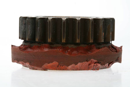 Dans les mois qui ont précédé l'accident, l'alternateur entraîné par engrenage a fait l'objet de certaines travaux de maintenance en raison d'une indication de panne d'alternateur. Le coupleur d'entraînement de l'alternateur avait été remplacé environ cinq heures de vol avant la tenue du vol en question. Il manquait beaucoup de caoutchouc sur les parties avant et arrière du coupleur qui a été déposé à ce moment-là. Par conséquent, le joint coulissant tournait sans s'encliqueter dans la coupelle comme il le devait. À l'intérieur de la coupelle se trouvait également une rondelle plate faite à la main et non approuvée, dont les bords étaient très rugueux et striés. Ce type d'alternateur n'est pas conçu pour être utilisé avec une telle rondelle, et cette dernière n'est pas approuvée aux fins de réparation et de maintien de la navigabilité du moteur. Cette rondelle a forcé l'anneau en caoutchouc à sortir plus qu'il ne devait de la coupelle et à toucher la denture de la roue dentée d'entraînement de l'alternateur du vilebrequin. Par conséquent, la partie en caoutchouc du coupleur a été détruite. Des particules en caoutchouc de diverses tailles se sont retrouvées dans le puisard du moteur (voir la photo 1).