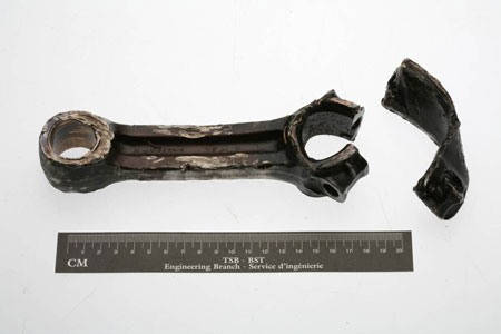 Il est fort probable que la panne moteur a été causée par l'obstruction partielle de l'écoulement d'huile alimentant le coussinet de maneton de la bielle et le palier de vilebrequin numéro deux; cette obstruction provenait des débris qui se trouvaient dans l'huile. Elle a entraîné une augmentation graduelle du dégagement à cet endroit; la course du piston a graduellement augmenté et le contact entre le piston et le cylindre et les soupapes s'est accru. Cette augmentation du dégagement a provoqué des forces de réaction répétées sur le palier de vilebrequin numéro deux; le martèlement continu a provoqué sa fissuration par fatigue, ce qui a fini par briser la coquille gauche du coussinet du maneton. La bielle a continué à surchauffer et à allonger cette partie du maneton jusqu'à ce que l'écrou borgne bas du chapeau de la bielle se détache. C'est alors que le moteur s'est grippé et qu'il est tombé en panne totale.