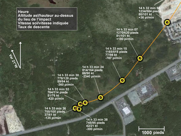 Quand les pilotes se sont rendu compte que le moteur ne reprenait pas de la puissance, ils avaient dépassé la tourbière. Ils ont alors exécuté un virage serré de 180 degrés en tentant de retourner à la tourbière pour y faire un atterrissage forcé, ce qui a mis l'hélicoptère dans une situation d'atterrissage par vent arrière de 25 nœuds. L'autorotation a été exécutée à une vitesse indiquée plus grande que celle recommandée qui a, une fois combinée au virage serré, augmenté le taux de descente. Ce taux de descente élevé n'a pas pu être annulé avant le toucher en raison du bas régime du rotor principal.