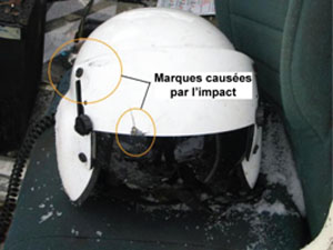 Le pilote instructeur ne portait pas de casqueFootnote 5 et il a subi de graves blessures au visage et à la tête. L'autre pilote portait un casque et il n'a pas subi de blessures à la tête; des marques sur le casque montrent qu'il y a eu contact avec la structure de l'hélicoptère pendant l'impact (voir la photo 1).