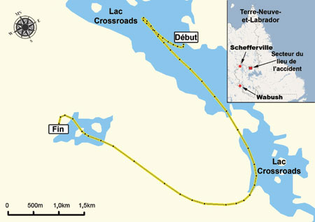 Vers 8 h 13, heure avancée de l'Atlantique, le de Havilland DHC-2 (Beaver) sur flotteurs (immatriculé C FPQC, numéro de série 873) exploité par Labrador Air Safari (1984) Inc., décolle du lac Crossroads (Terre-Neuve-et-Labrador) avec à son bord le pilote et six passagers. Quelque trois minutes après le décollage, pendant la montée initiale, le moteur tombe brusquement en panne alors que l'appareil se trouve à quelque 350 pieds au-dessus du sol et vole à une vitesse-sol d'environ 85 mi/h. Le pilote amorce un virage à gauche et, peu après, l'hydravion s'écrase dans une tourbière. Le pilote et quatre des passagers subissent des blessures graves; les deux autres passagers subissent des blessures légères. L'hydravion subit des dommages importants, mais aucun incendie ne se déclare après l'impact. Les forces d'impact entraînent le déclenchement de la radiobalise de repérage d'urgence (ELT).