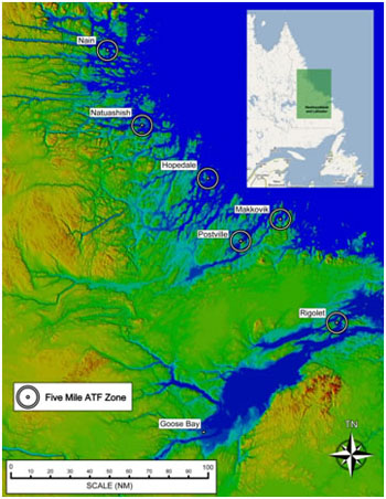 - Le long de la côte du Labrador, les opérations de vol nécessitent de nombreux changements de fréquences radio entre les fréquences en route et de trafic aérodrome (ATF). Cette zone a de nombreuses caractéristiques en commun avec la côte ouest de la Colombie-Britannique et la Basse-Côte-Nord du Québec, deux zones où un couloir ATF a été établi.