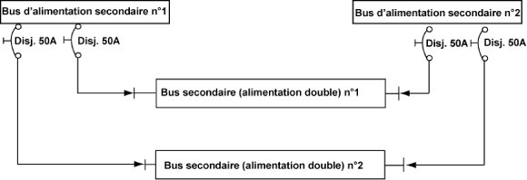 Comme le montre la figure 1, l'électricité provenant du bus d'alimentation secondaire no 1 passe par un disjoncteur de bus secondaire de 50 ampères et une diode d'alimentation secondaire, alimentant le bus secondaire (alimentation double) no 1. Ce bus secondaire no 1 est également alimenté par une deuxième source d'électricité provenant du bus d'alimentation secondaire no 2 et passant par un circuit séparé comprenant un disjoncteur de 50 ampères et une diode. La configuration du bus secondaire no 2 est semblable.
