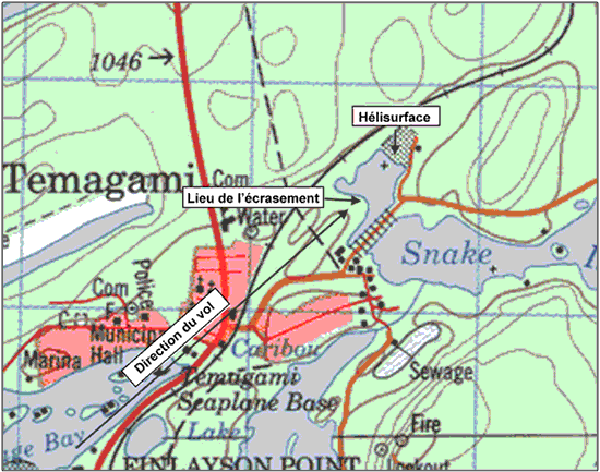 L'hélicoptère doit survoler la ville et une petite colline afin d'effectuer l'approche de l'hélisurface. La colline commence à 2430 pieds à l'horizontale de l'hélisurface et atteint une altitude d'environ 1017 pieds asl, environ 20 pieds plus haut que l'hélisurface. La colline descend doucement pour atteindre la rive du lac à 723 pieds à l'horizontale de l'hélisurface, laquelle se situe sur la rive opposée du lac (voir l'annexe A - Carte topographique de Temagami).
