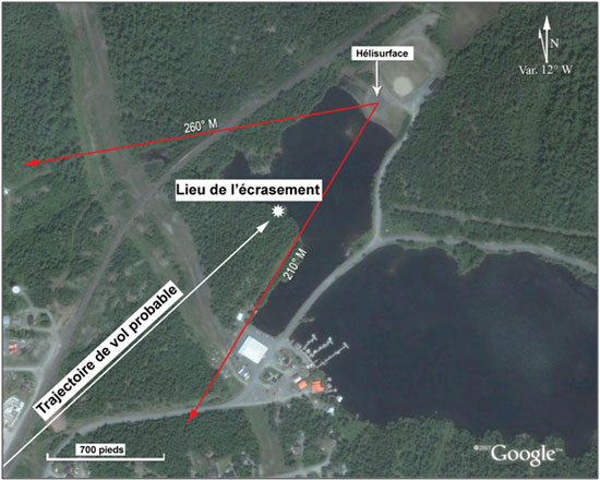 Les arbres sur la trajectoire d'approche mesuraient environ 40 pieds de hauteur. L'hélicoptère a percuté des arbres qui se trouvaient sur la pente descendante de la colline, à environ 70 pieds à l'horizontale de la rive, là où la pente de la colline est 10 pieds plus haute que l'hélisurface. Ainsi, la hauteur moyenne des arbres était d'environ 50 pieds plus haut que l'hélisurface. La descente à travers les arbres était presque à la verticale, avec pratiquement aucun mouvement horizontal, le nez de l'hélicoptère s'immobilisant à environ 15 pieds de la rive. Le diamètre du rotor de l'hélicoptère était de 44 pieds et les dommages causés aux arbres se trouvaient principalement dans ce périmètre. Les pales de rotor ont été complètement détruites. Pendant la descente, un arbre a traversé le compartiment du train d'atterrissage gauche, la batterie de bord, ainsi que le plancher moteur et le collecteur d'échappement du moteur droit. Il y avait des signes de chaleur et de brûlures sur l'arbre compatibles avec la chaleur dégagée par un moteur en marche, mais il n'y a pas eu d'incendie après l'impact.