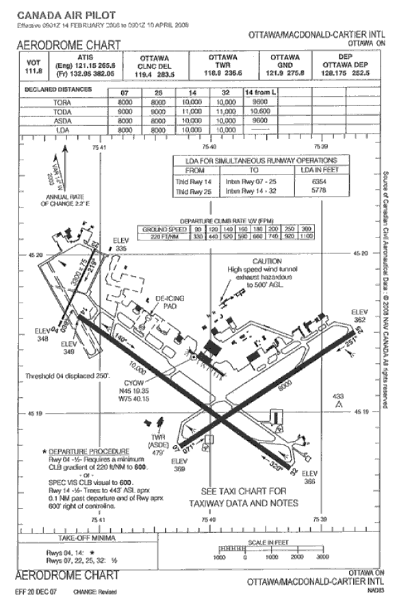 L'aéroport international d'Ottawa possède trois pistes : la piste 07-25, qui mesure 8000 pieds de longueur sur 200 pieds de largeur et qui est bitumée; la piste 14-32, qui mesure 10 000 pieds de longueur sur 200 pieds de largeur et qui est bitumée; enfin, la piste 04-22, qui mesure 3300 pieds de longueur sur 75 pieds de largeur et qui est bitumée (voir l'Annexe A — Carte de l'aéroport d'Ottawa). La piste 14 permet les approches au VORFootnote 11 (altitude minimale de descente (MDA) de 533 pieds agl). La piste 07 permet les approches à l'ILS (hauteur de décision de 200 pieds agl). L'approche à l'ILS de la piste 07 se fait selon une trajectoire de descente de 3° à un cap magnétique d'alignement de piste de 071°. Le point d'interception au sol de la trajectoire de descente se trouve 1068 pieds au-delà du seuil de piste. L'aire de dépassement de la piste 07 est constituée d'une surface en dur large de 200 pieds qui s'étend sur 150 pieds à partir de l'extrémité de la piste. Au-delà, il y a de l'herbe sur environ 750 pieds.