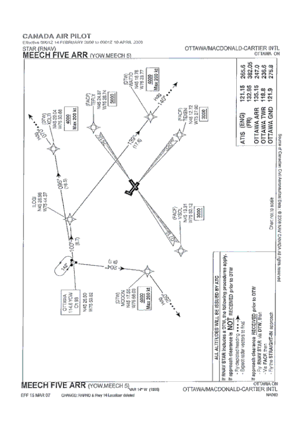 Avant la descente depuis l'altitude de croisière, à savoir le niveau de vol (FL) 390Footnote 3, l'équipage a écouté le message Echo du service automatique d'information de région terminale (ATIS), ce qui lui a permis d'obtenir confirmation que la piste 14 (longue de 10 000 pieds) était en service. L'équipage a fait un exposé portant sur une approche de la piste 14 et il a réglé les instruments du poste de pilotage en conséquence. Pendant la descente vers Ottawa, WJA 846 a été avisé qu'il y avait eu un changement de piste en service de la piste 14 à la piste 07 et que l'ATIS en était maintenant au message Foxtrot. L'équipage a fait un exposé en prévision d'une approche à l'aide du système d'atterrissage aux instruments(ILS) de la piste 07 à partir de la procédure d'arrivée Meech Five et il a réglé les instruments du poste de pilotage en conséquence (voir l'Annexe B — Arrivée Meech Five, et l'Annexe C — Approche à l'aide du système d'atterrissage aux instruments (ILS) de la piste 07 à Ottawa.