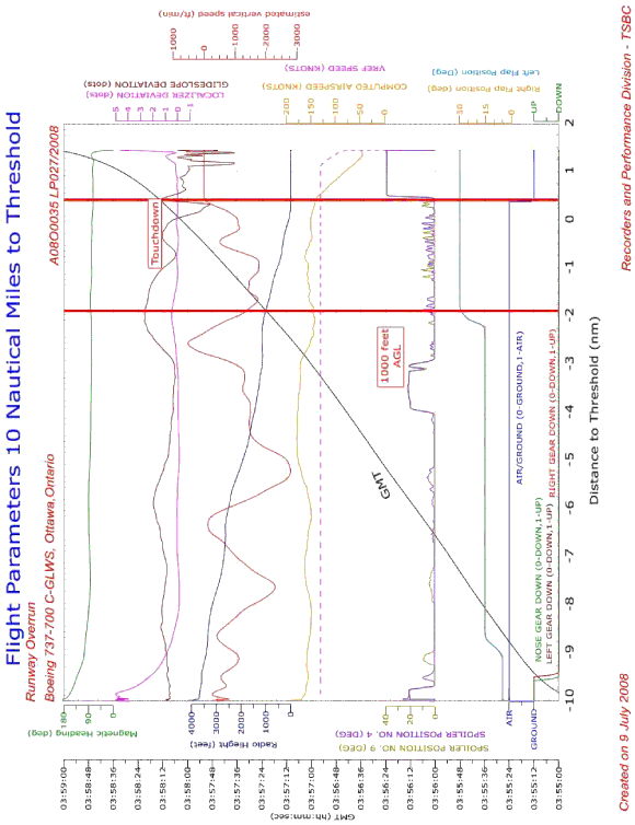 Immédiatement après le réglage des volets sur 30 et la conversation avec la tour, l'équipage s'est interrogé pendant un bref instant sur l'obligation de faire une approche interrompue. La décision a été reportée, quand bien même l'avion était presque à 1000 pieds au-dessus de l'altitude de l'aérodrome. À 1000 pieds comme tel, les paramètres de vol de l'avion étaient les suivants : configuration d'approche finale, manettes de gaz au ralenti, vitesse de 145 nœuds et avion au-dessus de la trajectoire de descente. Exception faite de la mise en palier momentanée, les manettes de gaz sont restées au ralenti pendant toute l'approche finale. L'avion est demeuré au-dessus de la trajectoire de descente pendant l'approche finale, sauf pendant trois brefs instants : à trois milles marins (nm) et à ¾ nm du seuil de la piste ainsi qu'au moment du survol du seuil (à 50 pieds agl). Le taux de descente a été supérieur à 1000 pieds par minute pendant la plus grande partie de l'approche (voir le Tableau 1).