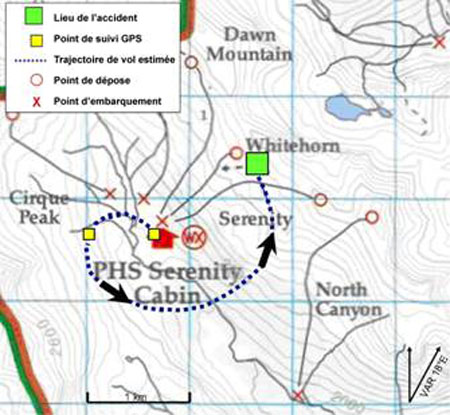 Pendant le vol en question, deux guides et sept skieurs avaient pris place à bord de l'hélicoptère au chalet Serenity, situé à quelque 7 000 pieds au-dessus du niveau de la mer (asl), près du fond de la vallée du ruisseau Canyon. Trois skieurs, qui étaient antérieurement avec le groupe, étaient demeurés au chalet. Le but consistait à transporter ces skieurs jusqu'à la pente de ski de Dawn Mountain, située à quelque 0,8 nm au nord du chalet Serenity, mais des bourrasques de neige au point de débarquement y réduisaient la visibilité. On a donc décidé de transporter les skieurs jusqu'à la pente de ski de Whitehorn, située à quelque 0,4 nm au nord-est du chalet Serenity, où la visibilité semblait meilleure. Le point de débarquement de Whitehorn, marqué au moyen de quatre poteaux munis de drapeaux (également appelés tiges ou piquets), était situé sur un replatFootnote 3, à quelque 8 100 pieds asl, à plusieurs centaines de pieds au-dessus de la limite forestière et à quelque 300 pieds au-dessous de la ligne de crête. Au-dessus de la limite forestière, le relief était principalement recouvert de neige, mais comportait certaines régions de roc exposé, notamment à un endroit qui était situé immédiatement derrière les lieux de l'accident et à un autre immédiatement au-dessous des lieux délimités par les drapeaux.