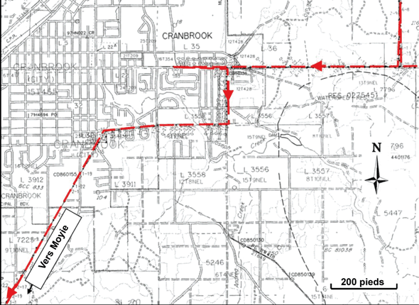 L'hélicoptère a décollé à 12 h 9Footnote 1 de l'héliport de l'entreprise Bighorn Helicopters Inc., au nord de la ville, et il a volé le long des lignes de transport d'électricité vers le nord-ouest de la ville. Il a refait le même trajet pour suivre les lignes vers l'est, puis s'est dirigé vers le sud. À 12 h 47, l'hélicoptère a viré vers l'ouest pour suivre les lignes vers un quartier résidentiel de la ville. À 12 h 58, l'hélicoptère se dirigeait vers le sud, en survolant la 30e avenue sudFootnote 2. Il a viré vers la droite pour suivre les lignes en direction ouest, au-dessus de la 9e rue sud. Quatre minutes plus tard, à proximité de la 10e rue et de la 14e avenue, l'hélicoptère a effectué plusieurs manœuvres à basse altitude (voir la photo 1 et l'annexe B – Carte de la ville de Cranbrook), et il semblait qu'on procédait à la vérification des lignes de transport d'électricité de la zone en question. Il volait en direction sud-sud-ouest au-dessus de la 14e avenue (à mi-chemin entre les 7e et 10e rues) à environ 120 pieds au-dessus du sol (agl) et à 25 nœuds lorsqu'il a perdu toute puissance moteur (voir la photo 2). L'hélicoptère a effectué une descente rapide; pendant les quelques dernières secondes de vol, l'appareil était ingouvernable et est tombé en chute libre d'une hauteur d'environ 85 pieds au-dessus du sol.