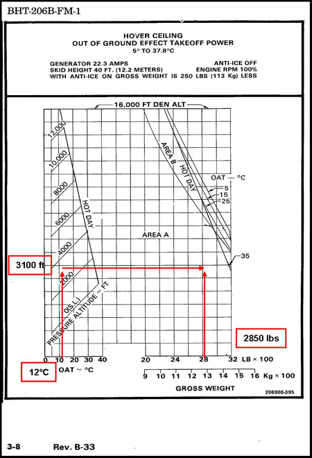 Le lieu de l'écrasement se trouvait à environ 3100 pieds au-dessus du niveau de la mer (asl) et, si la température ambiante était de 12 °C, l'altitude-densité aurait été d'environ 3400 pieds asl. Selon le manuel de vol du giravion du Bell 206B, le tableau du plafond en vol stationnaire hors effet de sol garantit que l'hélicoptère peut voler en stationnaire sans profiter des performances que procure l'effet de sol, selon une masse brute maximale autorisée pour différentes conditions d'altitude-pression et de température extérieure ambiante. Compte tenu des conditions du milieu au moment de l'accident, le tableau du plafond en vol stationnaire hors effet de sol indiquait que la masse de l'hélicoptère ayant à son bord les trois occupants se trouvait nettement dans la limite où l'hélicoptère aurait été capable de voler en stationnaire hors effet de sol (voir l'annexe C – Plafond en vol stationnaire hors effet de sol).