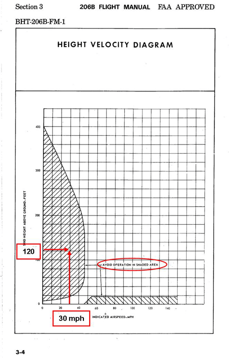La probabilité qu'une perte de puissance se produise n'est pas tributaire de l'altitude, de la vitesse ou du relief. Par contre, le risque de rater un atterrissage à la suite d'une perte de puissance augmente si l'altitude et la vitesse sont basses et si le relief est accidenté. Le diagramme de hauteur/vitesse présume que le relief convient à l'atterrissage, et tient seulement compte de l'altitude et de la vitesse; il ne tient compte d'aucun autre facteur d'exploitation, comme les compétences et l'expérience du pilote, les conditions météorologiques ou les obstacles. Le diagramme hauteur/vitesse représente donc le meilleur scénario possible, et indique le profil optimal de la trajectoire de vol pour le décollage, l'atterrissage et les régimes en route, en se fondant sur les performances aérodynamiques de l'hélicoptère.
