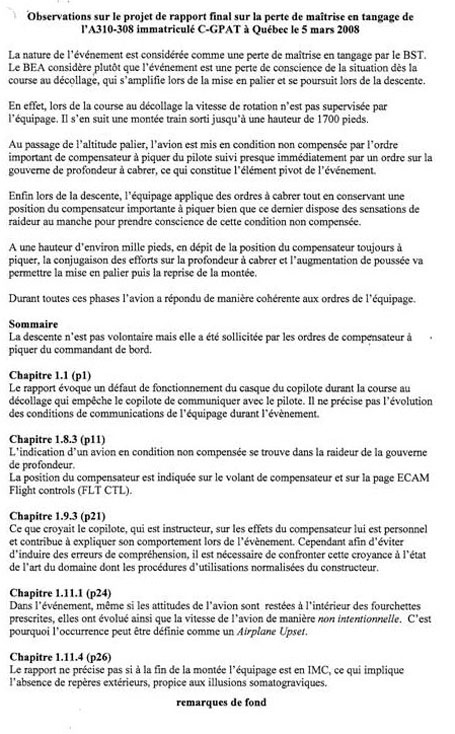 Par la suite, TSC211 vérifie son altitude et sa vitesse auprès du contrôleur du terminal de Québec et confirme le bon fonctionnement de l'anémomètre et de l'altimètre de l'avion. Le moniteur électronique centralisé de bord (ECAM) n'a généré aucun message de défectuosité en rapport avec le problème de contrôle de l'avion, et aucun voyant lumineux ni indication dans le poste de pilotage n'a signalé un défaut de fonctionnement de l'avion.