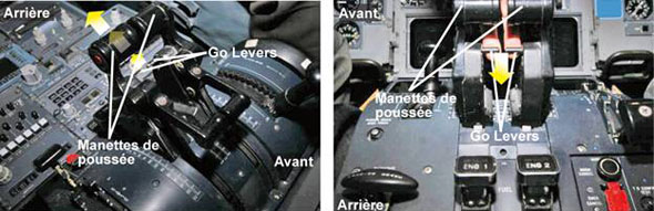 L'automanette est activée, entre autres, en appuyant sur les « Go Levers » situés sur les manettes de pousséeFootnote 26. Dans ce cas, un servomoteur déplace mécaniquement les manettes de poussée jusqu'à ce que la poussée cible affichée au TRP soit atteinte. En vol, quand les becs de bord d'attaque sont sortis, les « Go Levers » activent le mode « Go Around » de l'AFS.