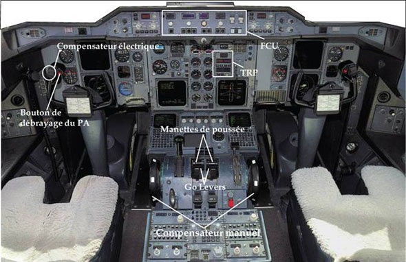 L'AFS est constitué de deux directeurs de vol, de deux PA et de deux systèmes d'automanette qui peuvent être embrayés indépendamment ou conjointement. L'AFS est contrôlé par l'entremise du FCU, du système de gestion de vol (FMS), du TRP (thrust rating panel) et des « Go Levers » (voir Photo 1).