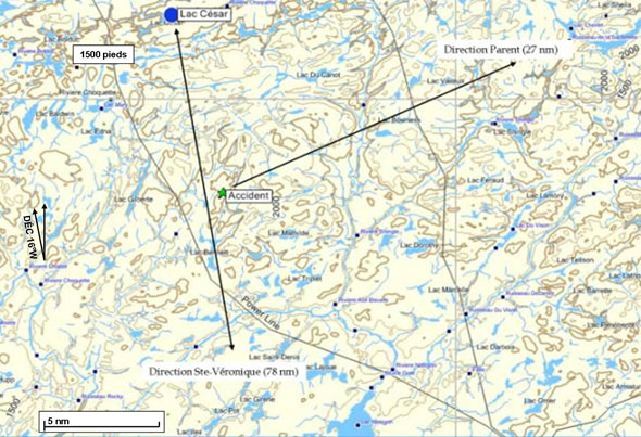 Le jour de l'accident, l'appareil, avec à son bord le pilote et deux passagers avait quitté la base du lac César vers 10 h 30Footnote 1, en direction de Sainte-Véronique, située à 78 milles marins (nm) au sud. Le vol a duré 55 minutes et s'est déroulé sans difficulté. Les conditions atmosphériques étaient propices au vol à vue. Tel qu'indiqué dans le manuel d'exploitation de la compagnie concernant la surveillance des vols, le pilote a appelé la base du lac César dès son arrivée à Sainte-Véronique. Le pilote n'avait pas d'obligation opérationnelle de retourner à la base du lac César, dans un délai précis. Le vol de retour n'était pas un vol payant.