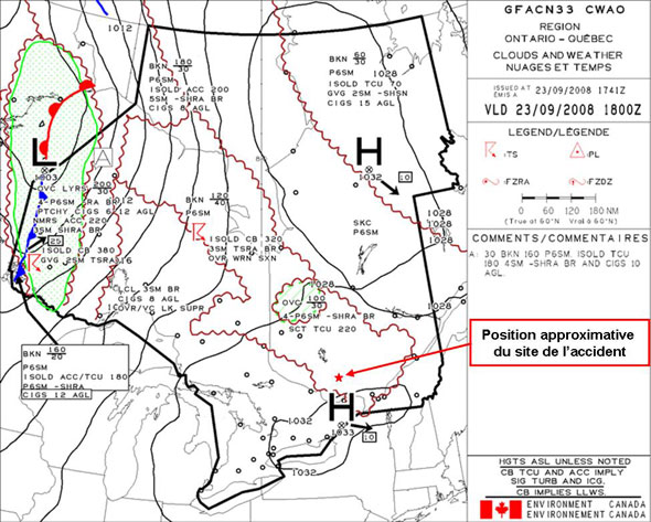 Les prévisions de zone graphique (Voir Annexe B – Prévision de zone graphique - GFACN33 CWAO) pour l'Ontario et le Québec (GFACN33 CWAO) émises à 1741ZFootnote 4 le 23 septembre 2008, valides à 1800 Z (14 h 00 HAE) étaient les suivantes :