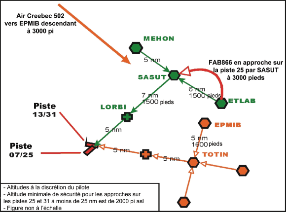 Le VP FSS a ensuite contacté CRQ502, l'a avisé que FAB866 était à 3000 pieds asl à 11 nm en parcours final pour la piste 25 et lui a demandé un compte rendu de position. CRQ502 lui a répondu qu'il était à 11 nm au nord de l'aéroport à 3000 pieds asl et qu'il avait l'intention d'effectuer une approche RNAV 31 en passant par le repère d'approche EPMIB (voir l'Annexe A). La trajectoire de vol de CRQ502 vers EPMIB le ferait traverser la trajectoire d'approche finale vers la piste 25 entre SASUT et LORBI.