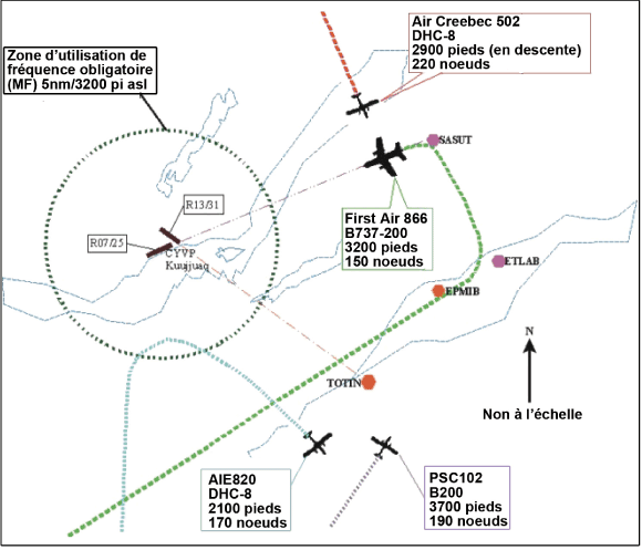 Le Boeing 737-248C immatriculé C-FNVT, numéro de série 21011, qui assure le vol 866 de First Air (FAB866), et le de Havilland DHC-8-102 (Dash-8) immatriculé C-GYWX, numéro de série 175, qui assure le vol 502 d'Air Creebec (CRQ502) sont tous les deux en rapprochement de Kuujjuaq (Québec), leur destination en espace aérien non contrôlé. CRQ502 a prévu de faire une approche RNAV piste 31; son heure d'arrivée prévue (ETA) est 12 h 22, heure avancée de l'Est (HAE). FAB866 a prévu de faire une approche RNAV piste 25; son ETA est 12 h 24 HAE. FAB866 est en finale à environ 12 milles marins (nm) lorsque son système anticollision embarqué (ACAS) signale la présence d'un autre aéronef. Alors que les deux appareils sont à la même altitude avec un espacement de 3 nm, le spécialiste de la station d'information de vol (FSS) de Kuujjuaq signale à FAB866 la présence de l'autre aéronef (CRQ502) et demande à CRQ502 de faire part de ses intentions. À 12 h 20, tout juste avant que son ACAS émette une alerte de proximité de trafic, FAB866 amorce une approche interrompue. CRQ502 se dirige alors vers le nord-est pour s'éloigner de l'aire d'approche. Les deux avions, qui évoluaient tous les deux dans les nuages, se sont approchés l'un de l'autre avec un espacement latéral de 2 nm et un espacement vertical de 200 pieds. FAB866 a atterri à 12 h 35 sans autre incident. CRQ502 a atterri à 12 h 52.