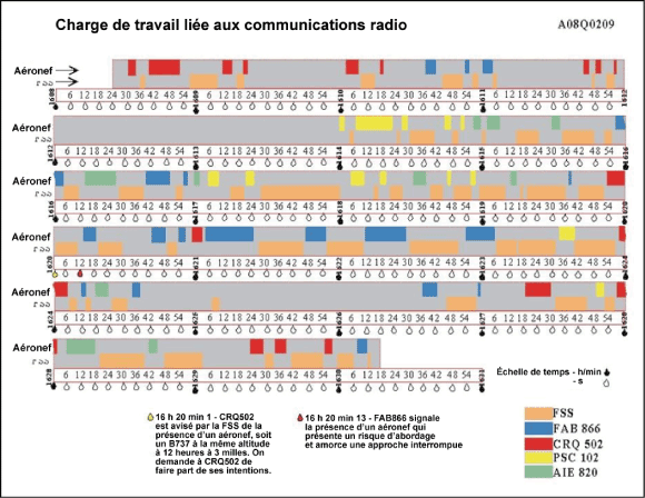 Le temps d'antenne disponible durant les 11 minutes précédant la résolution du conflit entre FAB866 et CRQ502 a été constitué à 91 % des communications verbales entre le VP FSS et les quatre appareils IFR en rapprochement de CYVP. Il restait donc très peu de temps pour permettre aux équipages de résoudre des conflits et arriver à une entente sur une séquence d'arrivée ordonnée. À plusieurs occasions, il s'est avéré que les équipages n'avaient pas entendu ou n'avaient pas compris les renseignements sur le trafic fournis par les autres aéronefs, même s'ils écoutaient la fréquence commune. Le VP FSS a donc été obligé de répéter les renseignements sur le trafic, souvent dans l'autre langue officielle. Du fait que les conditions qui prévalaient étaient des conditions IMC, il est peu probable que les équipages auraient pu apercevoir visuellement les autres aéronefs alors qu'ils étaient en rapprochement de l'aéroport et en approche vers la piste. En fait, aucun des équipages n'a pu établir le contact visuel avec les autres aéronefs.