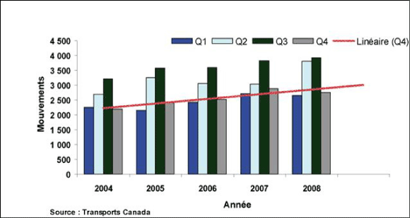 CYVP est un aéroport-pivot de la région nordique du Québec. Des transporteurs commerciaux offrent des vols locaux aux petites communautés, ainsi que des vols réguliers sur le sud du Québec. En 2008, il y a eu 13 129 mouvements locaux et itinérants d'aéronefs. Dans les cinq dernières années, le trafic a augmenté en moyenne de 6 % par année (voir l'Annexe D — Mouvements d'aéronefs à l'aéroport de CYVP et la tendance par quart). Bon nombre des aéronefs commerciaux qui se rendent à CYVP sont des aéronefs de passagers de type moyen porteur et grand porteur d'une capacité de 50 passagers ou plus.