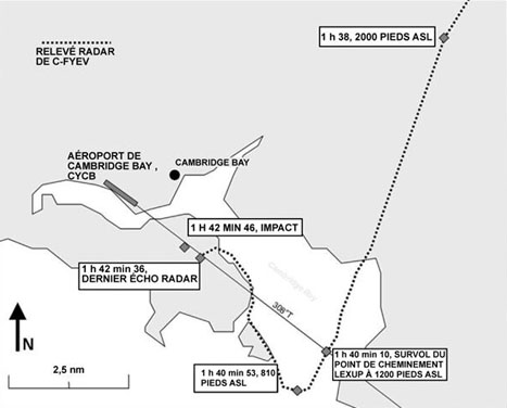 Peu après avoir dépassé LEXUP, le commandant de bord a remarqué que le récepteur GPS n'était pas passé automatiquement au point de cheminement d'approche interrompue au seuil de la piste 31 vrais. Pendant que le copilote reprogrammait le récepteur GPS pour obtenir une route directe vers le seuil de piste, l'avion s'est dirigé vers le sud sur une trajectoire presque perpendiculaire à la trajectoire de rapprochement de la piste. Le récepteur GPS a donné une trajectoire directe vers le seuil de piste à un cap de 319 degrés vrais, soit 11 degrés de plus que la trajectoire d'approche finale publiée (308 degrés vrais). À environ 1,3 nm au sud du prolongement de l'axe de piste, l'avion a entamé un virage vers la droite et s'est dirigé vers la lumière diffuse émanant de l'agglomération de Cambridge Bay sur une trajectoire variant de 332 degrés vrais à 020 degrés vrais. On a amorcé une descente de 400 à 500 pieds par minute à ce moment-là. Les dernières données radar sur l'altitude recueillies à 1 h 40 min 53 s indiquaient que, à 5,8 nm du seuil de piste, l'avion se trouvait à 810 pieds asl. À 1 h 41 min 30 s, l'alerte de l'altitude radar réglée à 500 pieds s'est déclenchée, et le copilote l'a signalée au commandant de bord. Ni l'un ni l'autre des pilotes n'a de nouveau fait allusion aux altitudes d'approche publiées ou réelles ni surveillé les altimètres de l'avion durant le reste de l'approche.