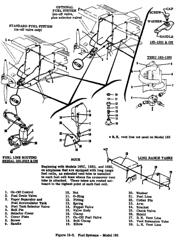 Un capteur de niveau de carburant à flotteur est monté dans chacun des réservoirs, et il est relié à un indicateur de quantité de carburant situé dans le tableau de bord. L'avion n'est pas équipé d'un système ou d'un voyant d'avertissement de bas niveau de carburant. Le carburant s'écoule par gravité dans des conduites d'alimentation reliées aux coins inférieurs avant et arrière de chacun des réservoirs d'aile. Les conduites d'alimentation en carburant sont raccordées à un accumulateur monté sur la cloison pare-feu, sous le tableau de bord. Le carburant contenu dans l'accumulateur s'écoule ensuite dans un robinet d'arrêt du carburant, un filtre à carburant et une conduite de dérivation de la pompe à carburant électrique d'appoint (lorsqu'elle ne fonctionne pas), vers la pompe à carburant entraînée par le moteur. La pompe à carburant électrique d'appoint comprend deux vitesses de fonctionnement (positions « HI » et « LO »), et elle est habituellement utilisée pour le démarrage du moteur ou la purge de vapeurs. La position « HI » est habituellement utilisée en cas d'urgence, notamment en cas de perte de puissance du moteur.