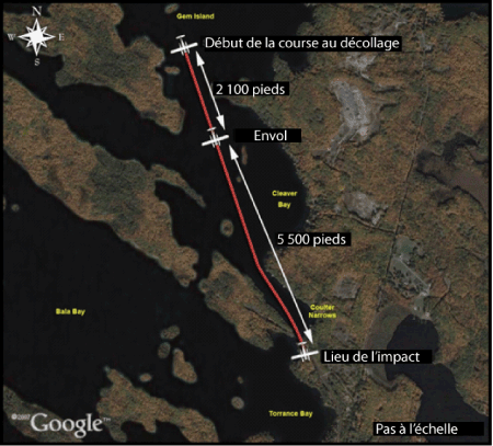 L'avion amphibie privé Cessna TU206G (immatriculation C-GGMG, numéro de série U2065768) décolle du lac Muskoka, situé près de Torrance (Ontario). Le pilote et un passager se trouvent à bord. Vers 14 h 33, heure avancée de l'Est, l'avion prend son envol, monte d'abord jusqu'à environ 30 pieds au-dessus du lac, puis continue sa montée jusqu'à une hauteur d'environ 90 pieds au-dessus du lac. Peu après, l'avion survole un pont de chemin de fer et commence à accrocher des arbres situés sur la rive. L'avion percute plusieurs grands arbres, se disloque sous l'effet de l'impact et s'écrase au sol sur le dos. Un incendie se déclenche après l'impact et brûle la majeure partie de l'appareil. Les deux occupants sont tués dans l'accident. La radiobalise de repérage d'urgence est détruite et n'émet aucun signal.