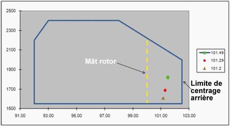 Il est acceptable de voler avec une limite de centrage arrière dans le domaine de vol certifié. Voler avec un centrage arrière oblige le pilote à maintenir une pression vers l'avant sur le manche cyclique, ce qui réduit la course disponible du cyclique vers l'avant. En conditions normales, cette action fait partie des caractéristiques d'exploitation de l'hélicoptère et suppose une sollicitation douce du cyclique pour éviter d'atteindre la limite avant de la course longitudinale du cyclique. Il n'en demeure pas moins que le débattement disponible du cyclique peut s'avérer insuffisant pour permettre au pilote de contrôler l'hélicoptère dans certaines conditions inhabituelles.
