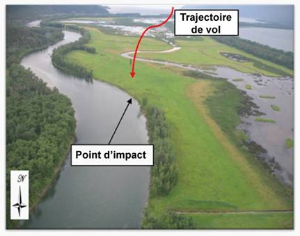 La traînée de débris montre que l'hélicoptère s'est désintégré en vol près de l'extrémité sud du lac Duck et qu'il est tombé en direction du sud, en direction de la rivière, ce qui représente une trajectoire d'environ 100 mètres. Les dommages à l'hélicoptère indiquent que le fuselage s'est écrasé dans la rivière, incliné à gauche dans une assiette quasi horizontale.
