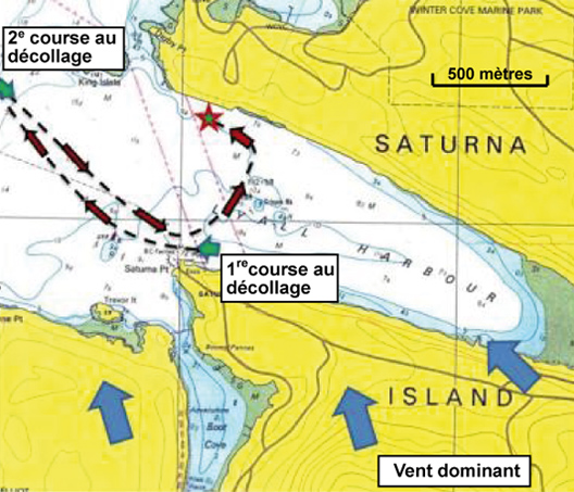 Les pilotes d'hydravion décollent généralement de Lyall Harbour dans une direction ouest à nord-ouest, une trajectoire de vol qui est libre de tout obstacle et présente une route plus favorable vers Vancouver. Après une tentative manquée de décollage vent arrière en direction nord-ouest, le pilote a tourné l'hydravion face au vent puis a décollé en direction de Lyall Harbour (voir la figure 1).