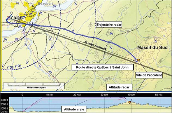 Le radar de Québec a suivi la trajectoire de l'appareil pratiquement jusqu'au site de l'écrasement (voir Figure 1). Peu de temps après le décollage, l'appareil s'est éloigné de la route directe. À la sortie de l'espace aérien de classe D, l'appareil a emprunté un cap d'intersection d'environ 10° vers la route directe. Deux minutes avant de disparaître de l'écran radar, la vitesse sol de l'avion est passée de 140 nœuds à 100 nœuds puis a augmenté à 170 nœuds pour finalement baisser à 50 nœuds. Au même moment, l'appareil bifurque vers le sud puis amorce un virage vers la gauche sur un cap final de 111 °M. L'altitude de l'appareil passe de 3800 pieds asl à 3100 pieds asl puis à 3400 pieds asl. L'appareil disparaît de l'écran radar à 5 h 9 min 4 s.