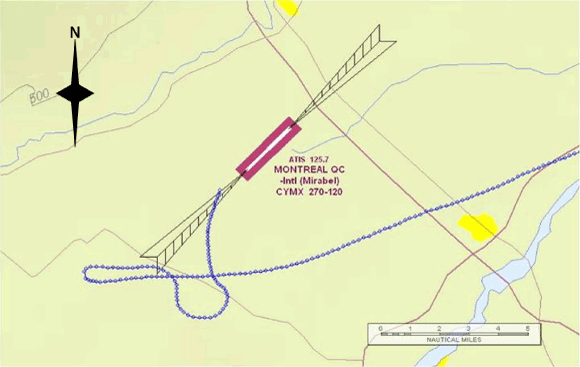 À 17 h 26, soit au bout de une heure et 14 minutes de vol, alors que l'appareil est à 7,4 nm au sud-ouest de l'aéroport de Mirabel, les deux moteurs perdent leur puissance. Le système de pilotage automatique se débranche et l'appareil amorce un virage par la droite d'environ 180°. (Voir Figure 1). Suite au virage, alors qu'il est 1000 pieds sous l'altitude assignée, le pilote avise le contrôle de la circulation aérienne (ATC) qu'il a des problèmes de moteur, mais il ne déclare pas d'urgence. Il indique que les moteurs semblent gelés. Un cap magnétique de 080° est assigné au pilote afin de le diriger vers l'aéroport de Mirabel. L'ATC demande s'il a besoin d'équipement d'urgence à Mirabel ou s'il désire déclarer une urgence. Le pilote décline l'offre. Bien qu'il ait collationné le cap de 080°, le pilote continue le virage vers le sud sur un cap magnétique d'environ 180° avant que lui soit assigné un nouveau cap vers Mirabel. Lorsque le pilote avise qu'il a la piste en vue, l'ATC l'autorise pour une approche visuelle piste 24, puisque le vent au sol de 6 nœuds favorise cette piste. À environ 4500 pieds asl, bien que les moteurs ne développent pas de puissance, le pilote rapporte que les moteurs fonctionnent toujours. Au cours de la descente, le pilote met les pompes de suralimentation en circuit, mais ceci n'a aucun impact. Les hélices ne sont pas mises en drapeau et continuent de tourner en moulinet. À 1600 pied asl et à 2,2 nm à l'ouest du seuil de la piste 06, le pilote avise Mirabel radio qu'il ne pourra atteindre la piste 24. L'appareil disparaît de l'écran radar à environ 400 pieds asl ou 150 pieds agl et s'écrase à 17 h 32 à 1,2 nm du seuil de la piste 06 de l'aéroport de Mirabel.