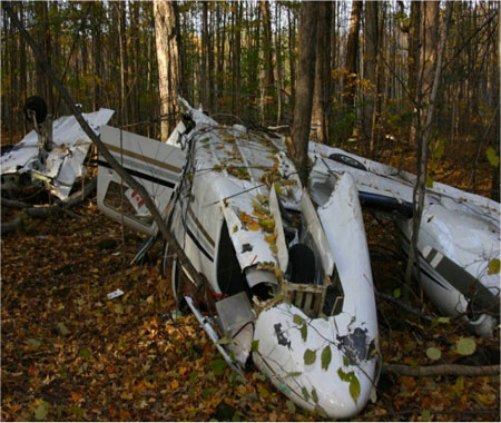 L'appareil s'écrase dans une érablière au travers d'arbres matures d'un diamètre moyen de 24 pouces et dépassant 100 pieds de hauteur. L'avion pénètre dans les arbres sur un cap magnétique de 040° avec un angle d'inclinaison vers la droite d'environ 30.