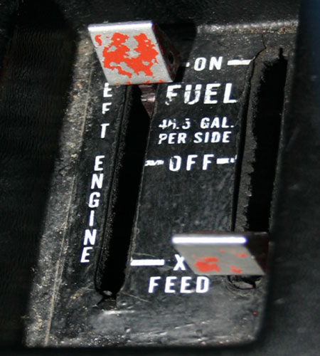Le système d'essence est pourvu de deux sélecteurs d'essence (voir Figure 3), un par moteur qui sont identifiés Left Engine et l'autre Right Engine. Chacun des sélecteurs comporte trois positions. La position avant (ON) permet à chaque réservoir d'alimenter son moteur respectif. La position centrale (OFF) coupe l'alimentation d'essence. La position arrière (XFEED) est la position d'intercommunication permettant l'alimentation d'un moteur à partir du réservoir opposé. Concrètement si le sélecteur de droite est sur XFEED, le moteur droit sera alimenté par le réservoir gauche.
